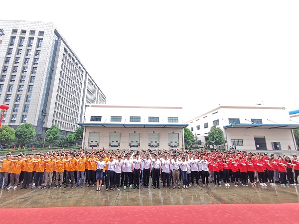 來自各部門、車間、不同工齡段的員工,身著紅、桔、白三種顏色的文化衫,組成色彩繽紛又整齊劃一的三個方陣,士氣高昂,氣勢如虹。